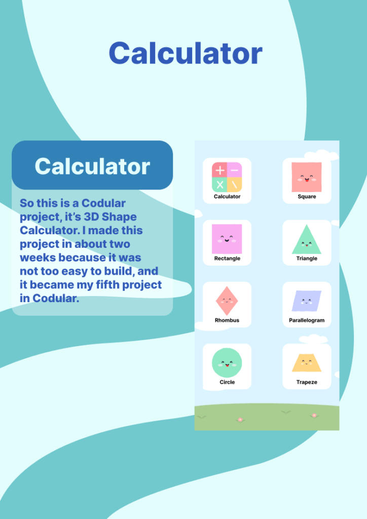 So this is a Codular project called 3D Shape Calculator. I worked on this project for about one month because it was quite difficult to build, and it became my last project in Codular after Name Card, Online Radio, Talk to Me, and Find My Age. The purpose of this app is to calculate the volume and surface area of different 3D shapes by asking for the necessary dimensions and then showing the result clearly to the user. Through this project, I learned how to combine multiple input components, apply mathematical formulas using blocks, and display the output in a simple and user-friendly way. Even though this app was challenging, it helped me strengthen my logic, improve my problem-solving skills, and gave me more confidence to work on advanced projects in the future.