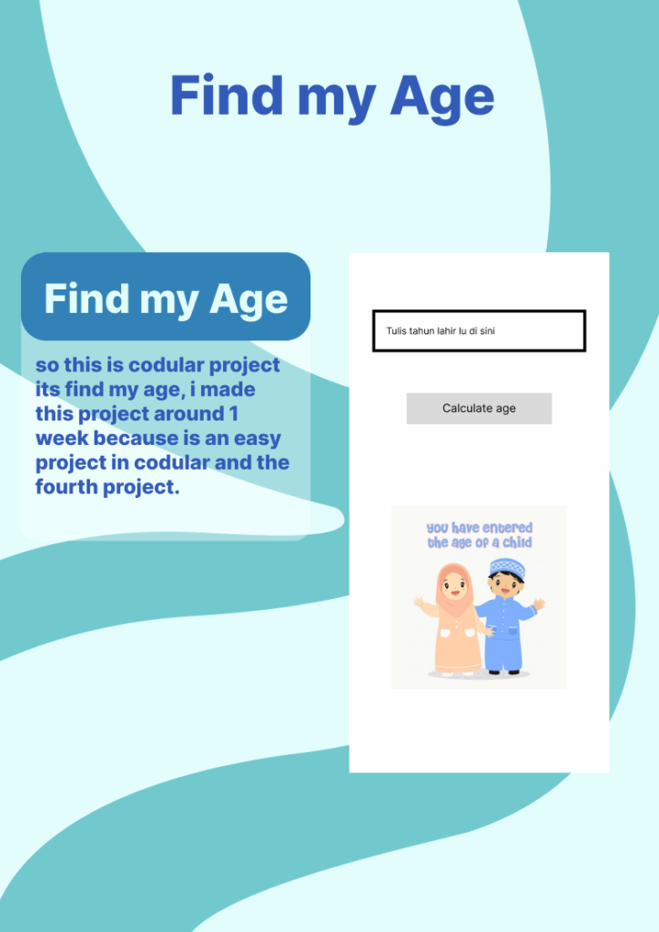 So this is a Codular project called Find My Age. I worked on this project for about one week because it was simple to build and became my fourth project in Codular after Name Card, Online Radio, and Talk to Me. The purpose of this app is to calculate a person’s age by asking for their birth year and then showing the result in years. Through this project, I learned how to use input components, process data with blocks, and display the output in a clear way for the user. Even though the app looks simple, it really helped me improve my logic and understand how to handle user inputs in Codular. Making this project also gave me more confidence to experiment with new features and try creating apps that are both useful and easy to use