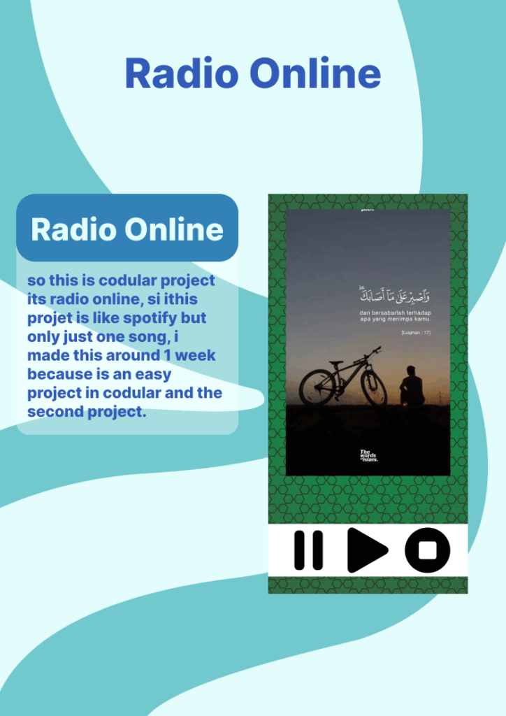 So this is a Codular project called Online Radio. The idea of this project is similar to Spotify, but it only plays one song instead of offering a full library of music. I worked on this project for about one week, since it was quite simple to build and it became my second project in Codular after the Name Card. Through this project, I practiced using audio components, designing the interface, and setting up blocks to make the music play smoothly. Even though it looks simple, this project helped me understand how streaming works in Codular and gave me more experience in creating functional applications. It also motivated me to continue exploring more advanced features and try making apps that are more interactive and useful in the future.