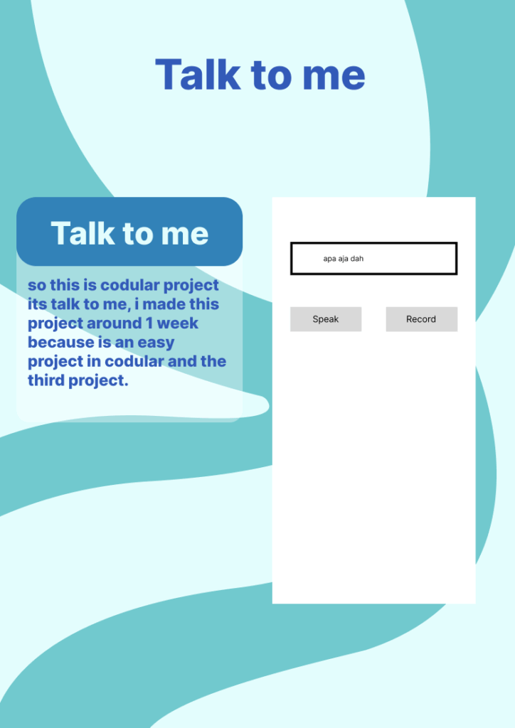 So this is a Codular project called Talk to Me. I created this project in about one week because it was quite easy to make using Codular, and it became my third project after the Name Card and Online Radio. The main function of this app is to convert text into speech, so users can type something and then hear it spoken out loud by the application. While working on this project, I learned how to use the text-to-speech component, design a simple user interface, and connect the blocks so that the app runs smoothly. Even though it is a simple project, it was very fun to make and helped me understand more about how Codular can be used to create interactive applications. This project also gave me more confidence to continue developing other creative ideas in the future.