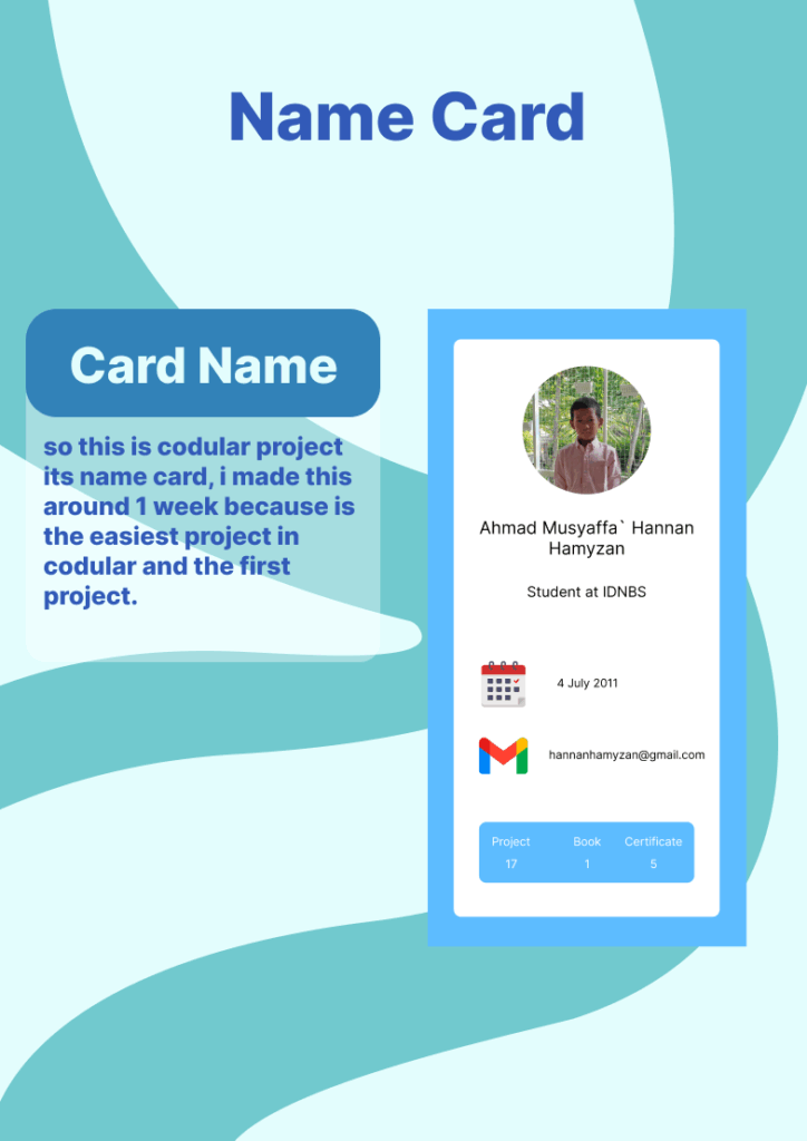 So this is a Codular project called Name Card. I created it in about one week since it was the easiest project to start with in Codular and also my very first project. Through this project, I learned the basics of how Codular works, including arranging components, setting properties, and using simple blocks for functionality. Even though it is a simple project, it gave me a good foundation to understand how to build apps step by step. Making this name card project helped me gain confidence to explore more features in Codular and prepared me to try more advanced projects in the future.