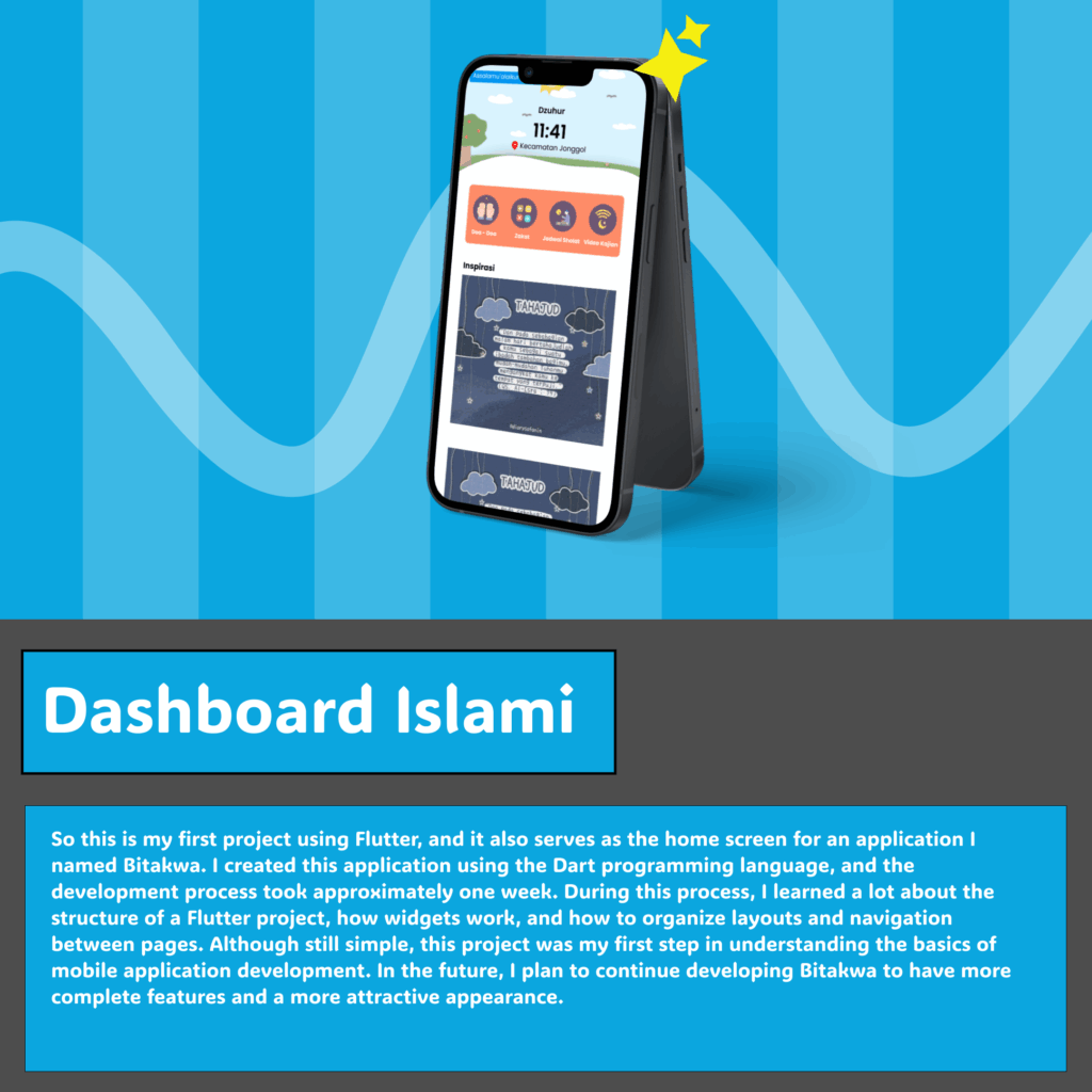 So this is my first project using Flutter, and it also serves as the home screen for an application I named Bitakwa. I created this application using the Dart programming language, and the development process took approximately one week. During this process, I learned a lot about the structure of a Flutter project, how widgets work, and how to organize layouts and navigation between pages. Although still simple, this project was my first step in understanding the basics of mobile application development. In the future, I plan to continue developing Bitakwa to have more complete features and a more attractive appearance.