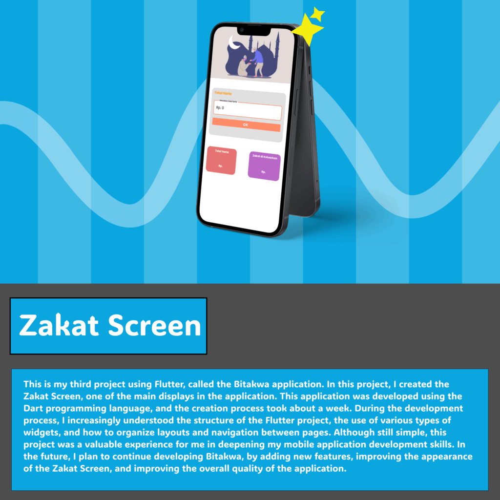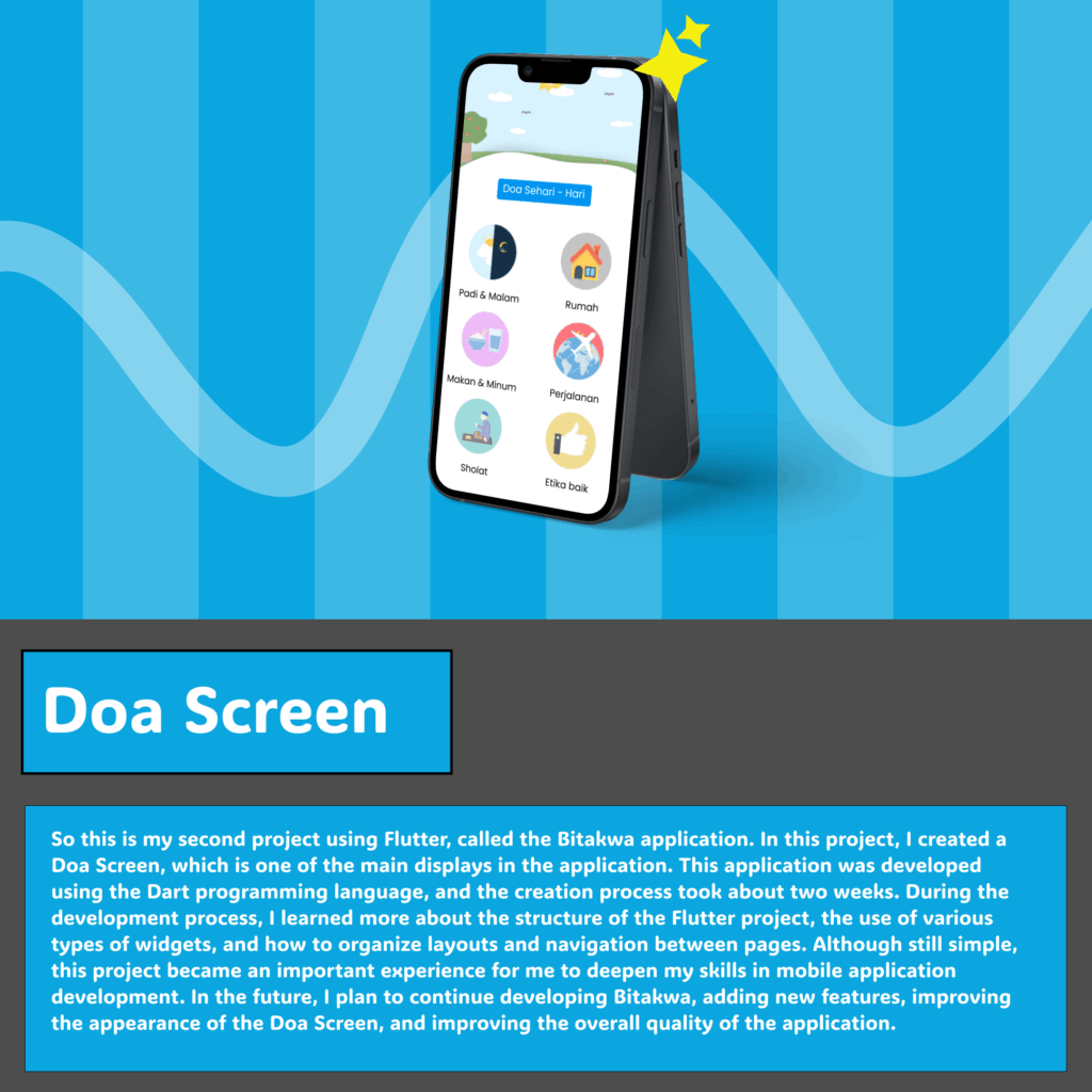 So this is my second project using Flutter, called the Bitakwa application. In this project, I created a Doa Screen, which is one of the main displays in the application. This application was developed using the Dart programming language, and the creation process took about two weeks. During the development process, I learned more about the structure of the Flutter project, the use of various types of widgets, and how to organize layouts and navigation between pages. Although still simple, this project became an important experience for me to deepen my skills in mobile application development. In the future, I plan to continue developing Bitakwa, adding new features, improving the appearance of the Doa Screen, and improving the overall quality of the application.